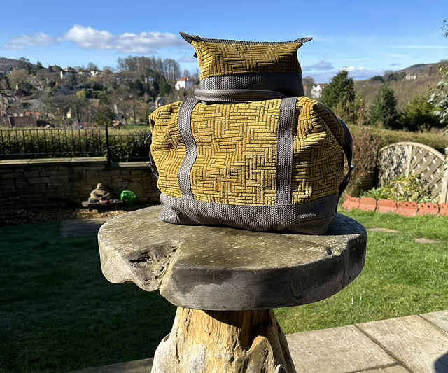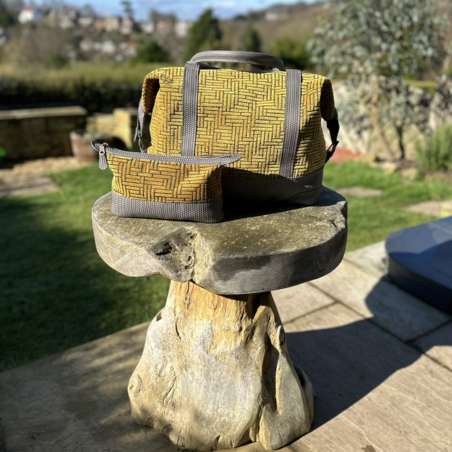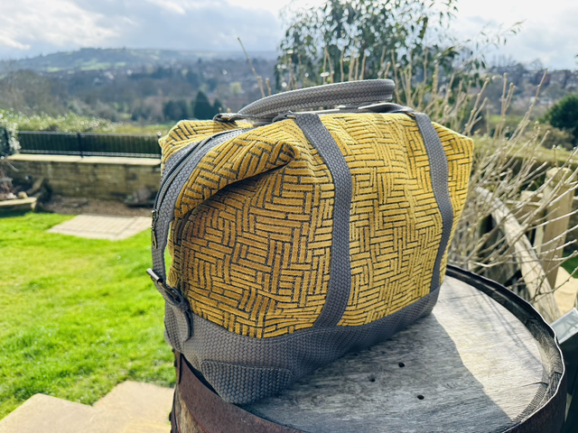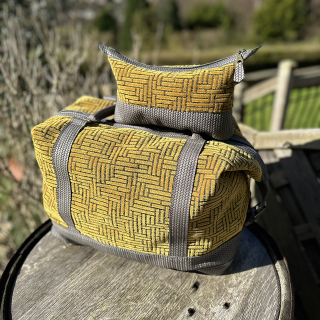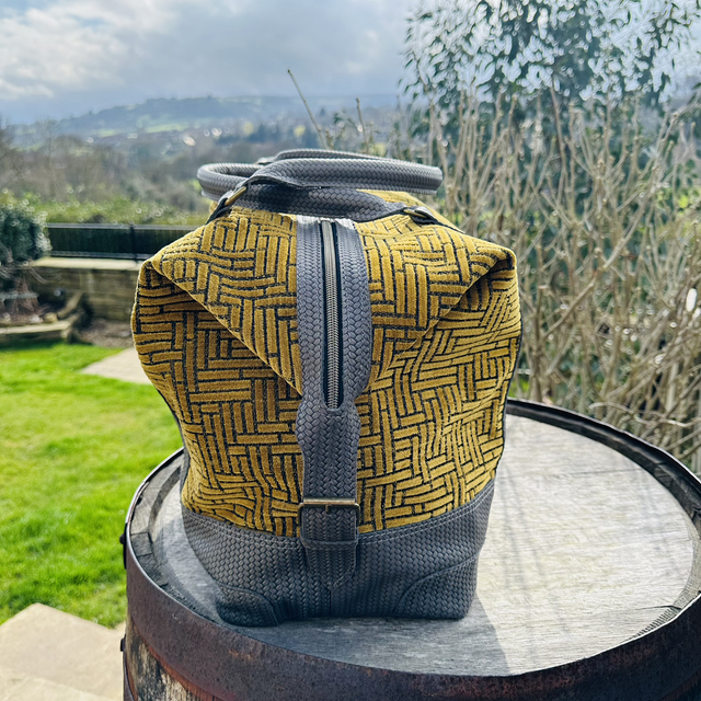 Beautifully hand crafted Weekender / Overnight bag. Made with stunning yet hard wearing chenille fabric in a mustard / gold colour. The interior of the bag is lined with a beautiful light grey fabric with leather trim framing the two large zipped pockets. The base, strap and handles are a weave pattern embossed leather in dark grey. The Art Deco geometry of the outer fabric works extremely well with the weave pattern of the embossed leather. A travel bag to be seen with!